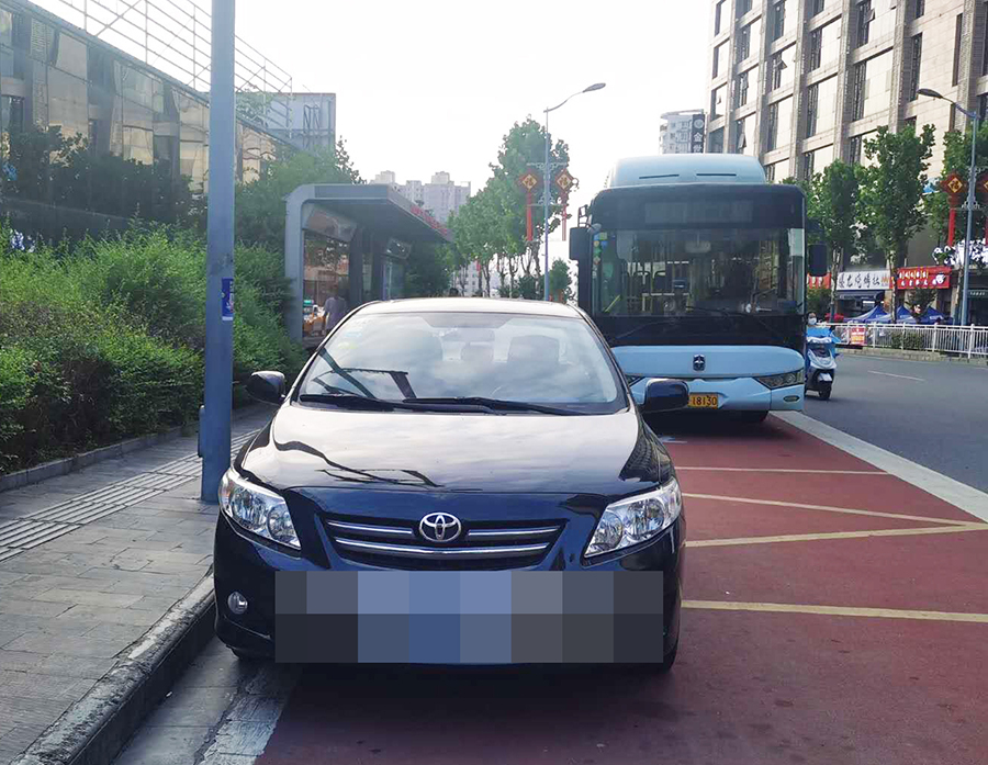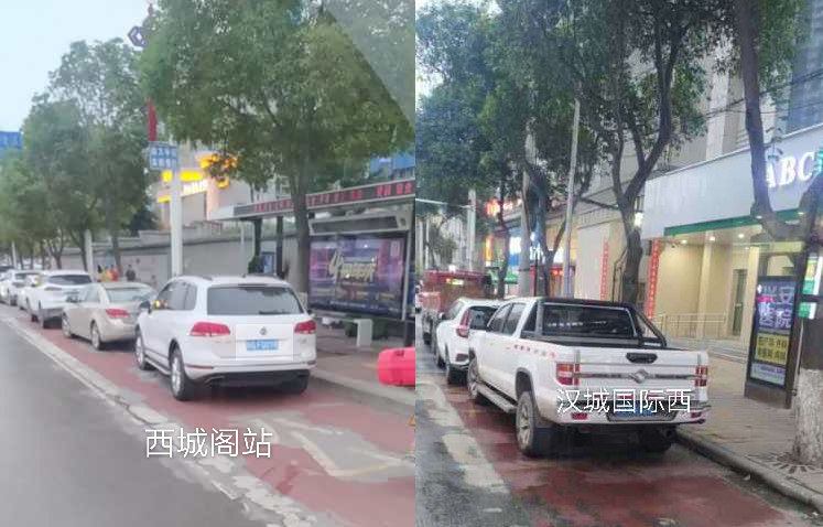 在金州廣場(chǎng)南站,十幾輛私家車“整齊劃一”的停在公交車站位置,地面紅色區(qū)域上的公交兩字也被完全覆蓋,從遠(yuǎn)處望去,站牌旁坐著幾個(gè)人正等待公交車的到來(lái)。在興華名城站,一輛私家車??吭诠卉囌厩埃倎?lái)的公交車無(wú)法按其規(guī)定進(jìn)站停車。在西城閣站和漢城國(guó)際西站,幾輛私家車甚是“任性”,儼然將公交車站當(dāng)成了“停車場(chǎng)”,筆者在此駐足十幾分鐘,它們依然“紋絲不動(dòng)”,有的車上甚至沒(méi)有車主。