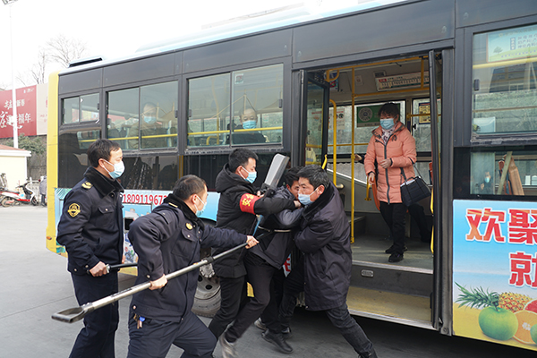 在火車站首末站,恰逢一車隊工作人員正在開展疫情防控應急演練,一未佩戴口罩的乘客欲乘車,駕駛員制止后,該乘客非但不聽,強行上車后辱罵、持刀相向駕駛員,駕駛員隨即將情況報告車隊長并報警,車隊安保人員將其制服??赐暄菥毢?,熊衛(wèi)軍、錢萬輝對工作人員面對突發(fā)事件的應急處置能力點贊。